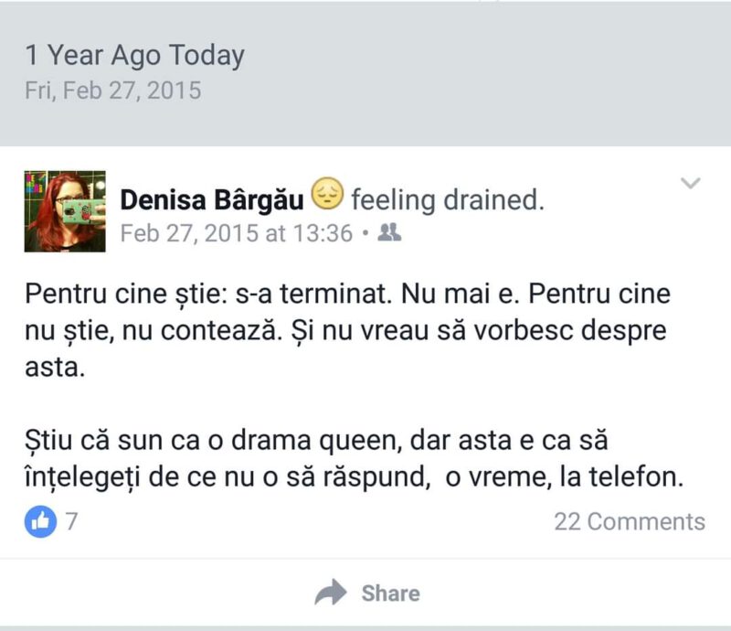 Pentru mine, a fost destul. Apoi am început să mă împac cu ideea de a nu mai aduce încă un copil în lumea asta și așa urâtă. Sigur, pe alocuri chiar avem motive să credem că lumea e frumoasă, că avem speranța de viață cea mai ridicată din istoria omenirii, că nu murim de foame sau în război (zilele acestea, e discutabil), dar asta nu e tot ce contează. Nu vreau să aduc pe lume un copil căruia să trebuiască să îi explic de ce oamenii sunt răi și mănâncă animale, de ce se omoară între ei, de ce aruncă gunoiul pe jos dar arată cu degetul către alții care fac la fel, de ce copiii fac cancer și de ce unii copii rămân orfani de mici, pentru că un tanardrogat și fără permis le-a omorât familia.