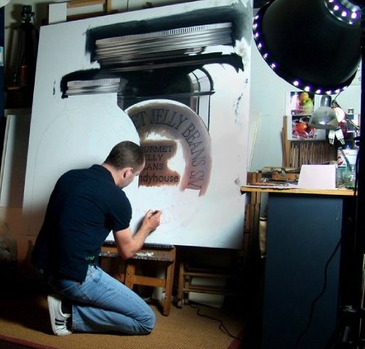 Site-ul artistului este pedrocampos.net. Pedro Campos este spaniol, locuieşte în Madrid şi are 46 de ani. După cum puteţi vedea în imaginea de mai jos, picturile nu sunt chiar mici.