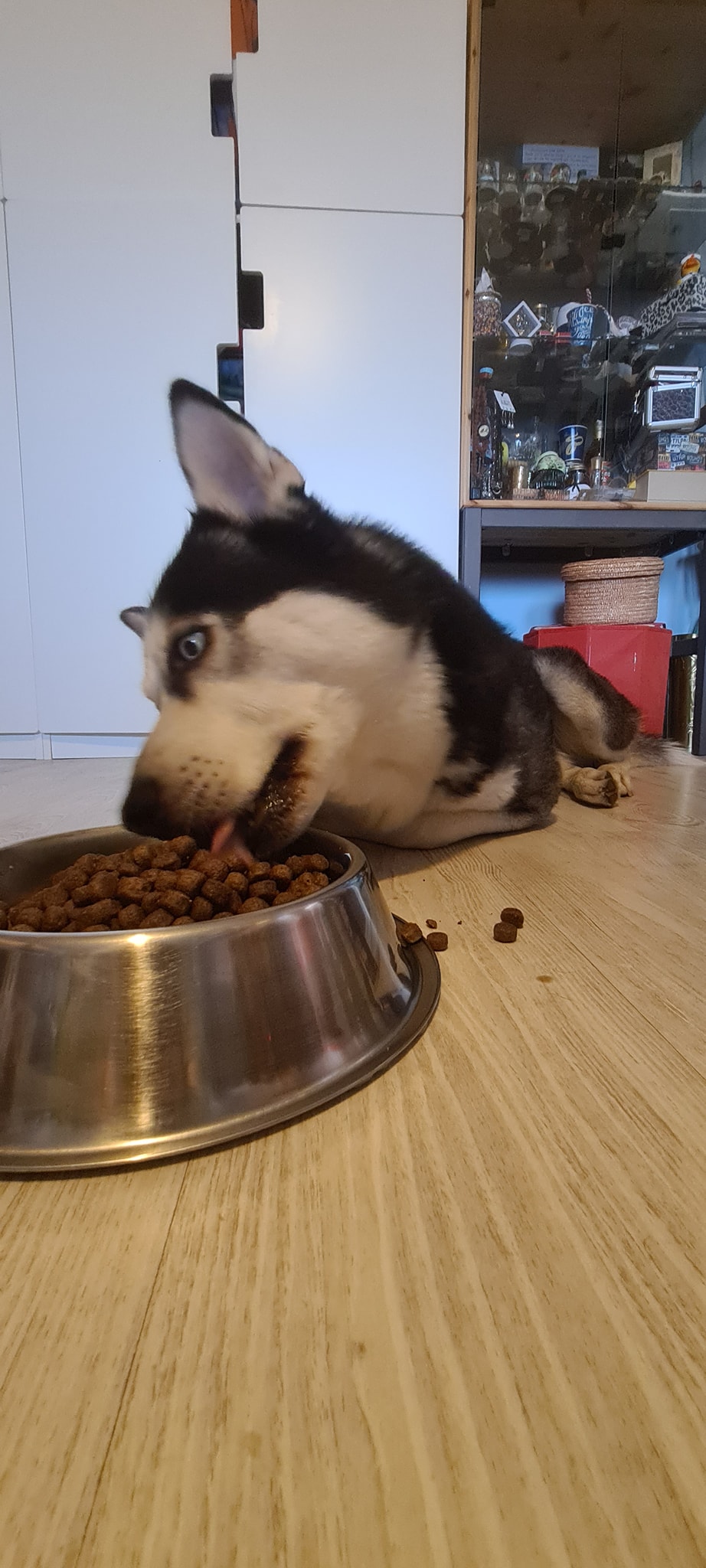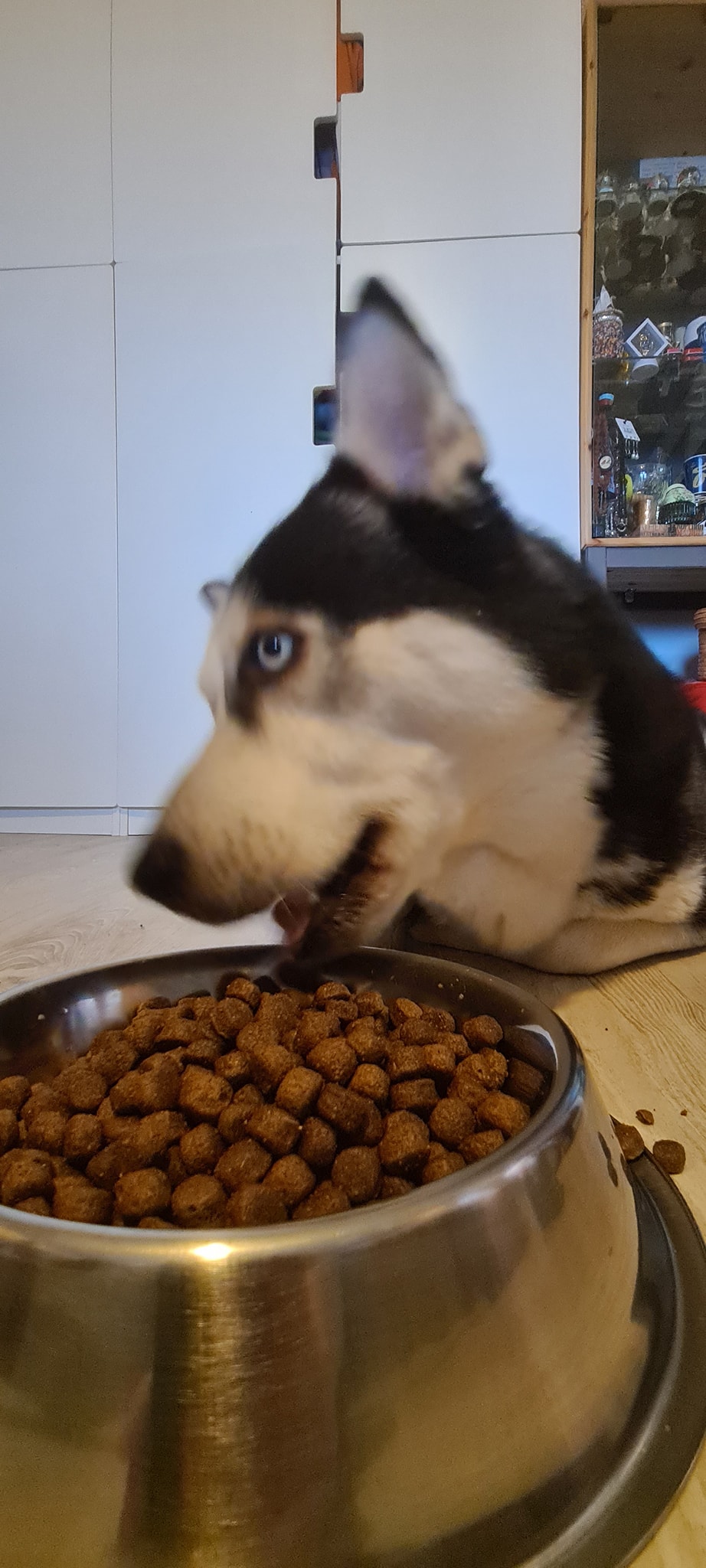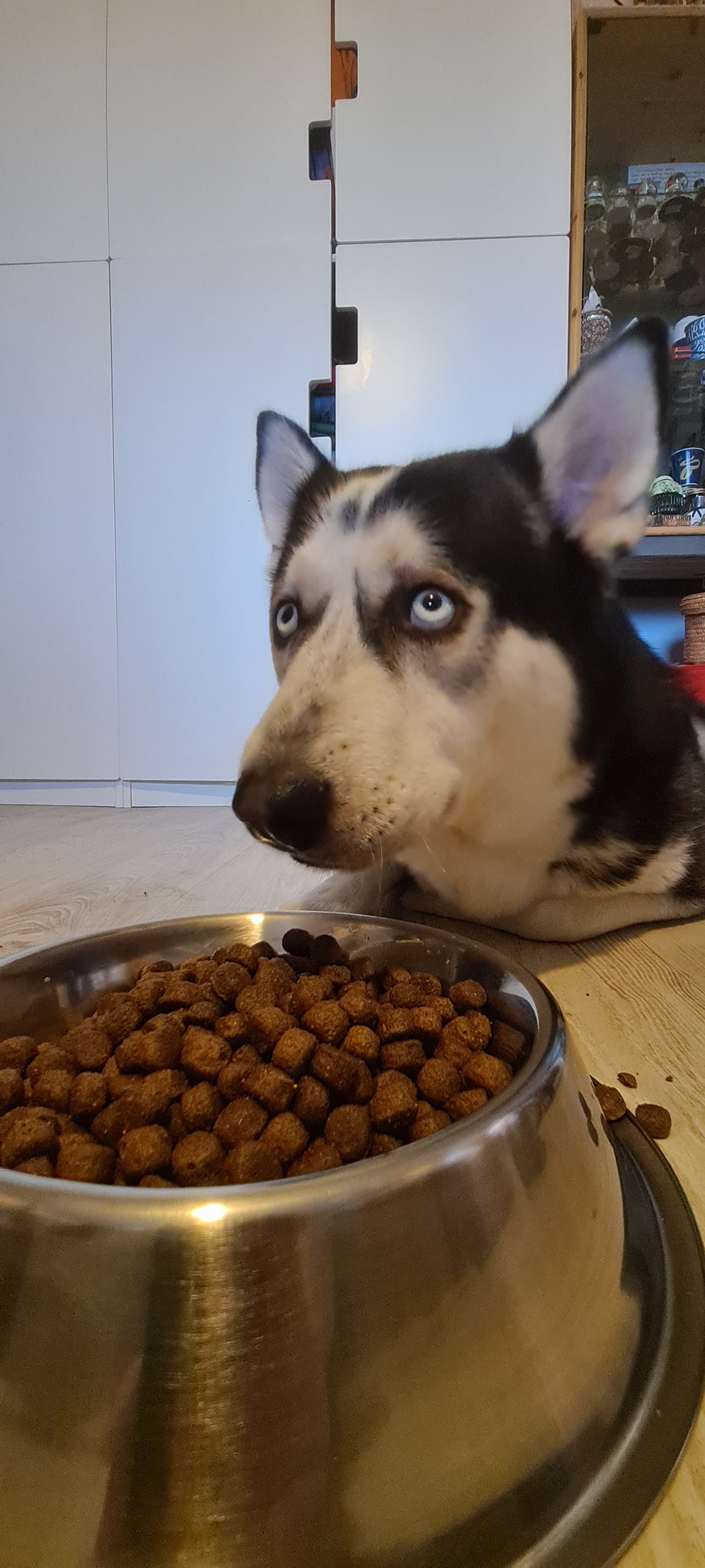 Cum spuneam, are boabe la discreție, apă rece într-un castron uriaș, iar seara, după ce vine de la „muncă”, primește tot felul de bunătăți: șuncă, pastramă, bacon, pateu, oase, gheare, carne de pui la cuptor, o felie de brânză topită care să-i deschidă apetitul și apoi, când vede că toți i-au dat ce au avut de dat, se duce la castronul cu boabe și dă cu nasul prin ele. Ăsta e un obicei recent, dobândit de când am început să-i mai dăm tot felul de „treats” din carne de porc. Face foarte multe figuri la bobițe. Prima dată dă cu nasul și se uită la noi cu o expresie de uimire amestecată cu furie. Tu nu vezi ce fac eu aici? SUNT PE CALE SĂ MĂNÂNC BOABE, ca ultimul vagabond (așa crede el, că amărâții de câini fără stăpân mănâncă boabe scumpuțe). Face câțiva pași în direcția noastră și dacă nu-i dăm nimic sau dacă-i spunem că nu mai avem nimic, se întoarce, resemnat, la boabe. „Dansul” continuă cu mestecarea ostentativă a câtorva boabe, urmată de privirea ucigătoare care pare să zică: AȘA AM AJUNS, VAI DE VIAȚA MEA! Apoi mănâncă o cantitate moderată de boabe, bea apă și se retrage sub masă sau în cameră, dacă are acces în balcon.