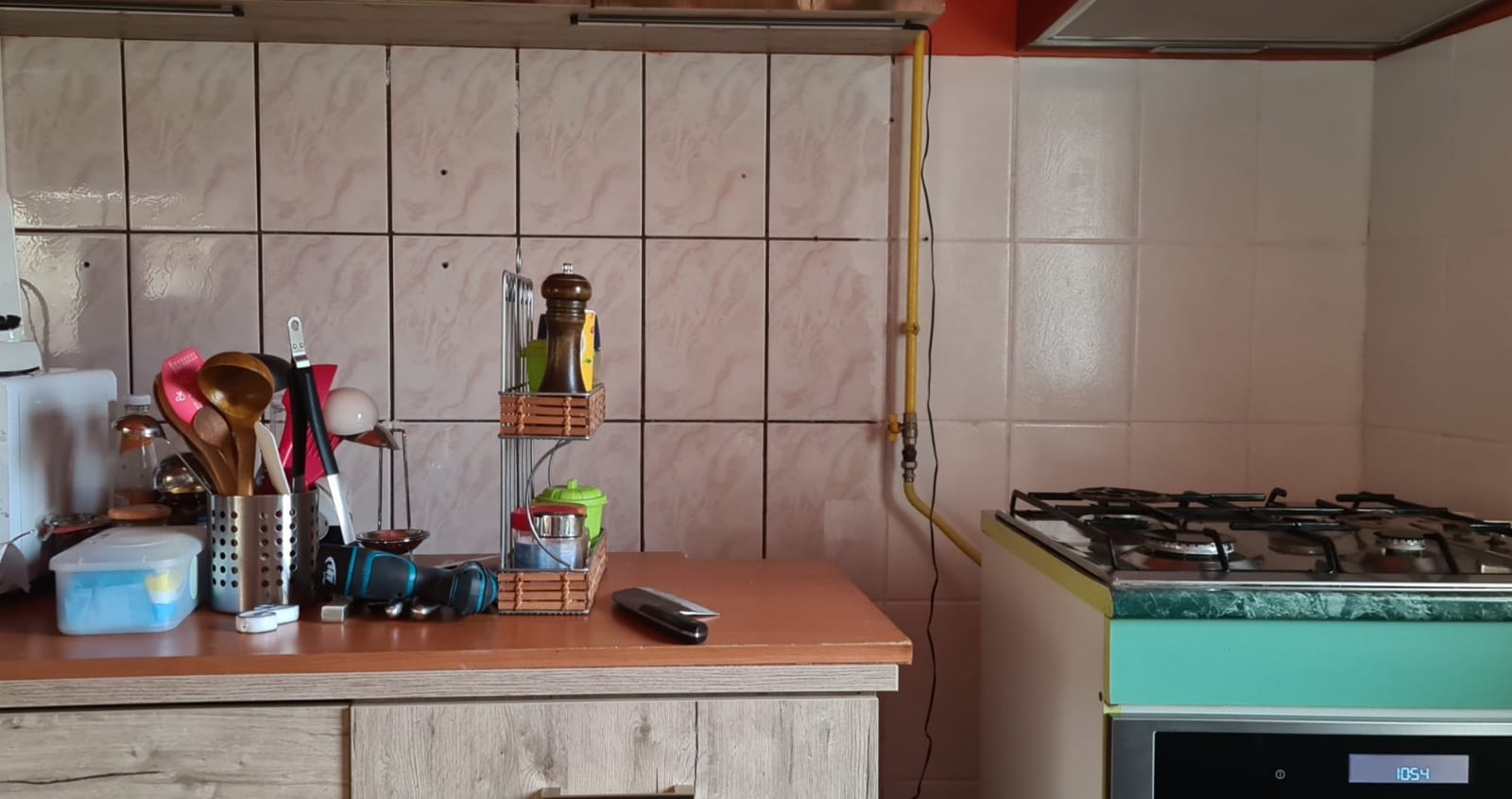 Aici se vede clar cât de urât arată un singur strat. După cel de-al doilea, am venit cu încă unul pe unde a fost nevoie și în zona aragazului și a chiuvetei am aplicat și lac peste vopsea, ca să fiu sigură că nu se duce.