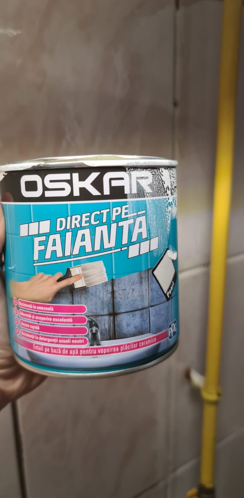 Oskar Direct pe Faianță este o vopsea foarte șmecheră, care se aplică așa cum îi spune și numele, direct pe faianță. Câteva condiții sunt, totuși: să fie foarte bine degresată/curățată faianța, dacă vrei și poți, să o șlefuiești pentru o mai bună aderență și să nu faci prostiile pe care le-am făcut eu. Imediat îți spun ce, ca să și înveți ceva din articolul meu.
